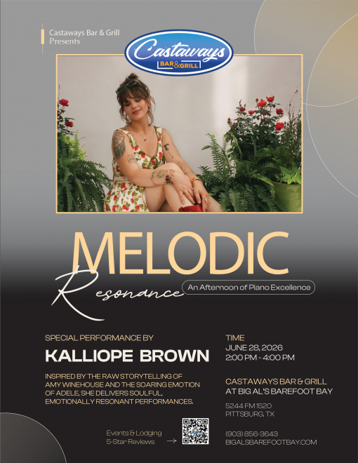 Kalliope Brown is a singer-songwriter and pianist from Sulphur Springs, TX. Inspired by the raw storytelling of Amy Winehouse and the soaring emotion of Adele, she delivers soulful, emotionally resonant performances.